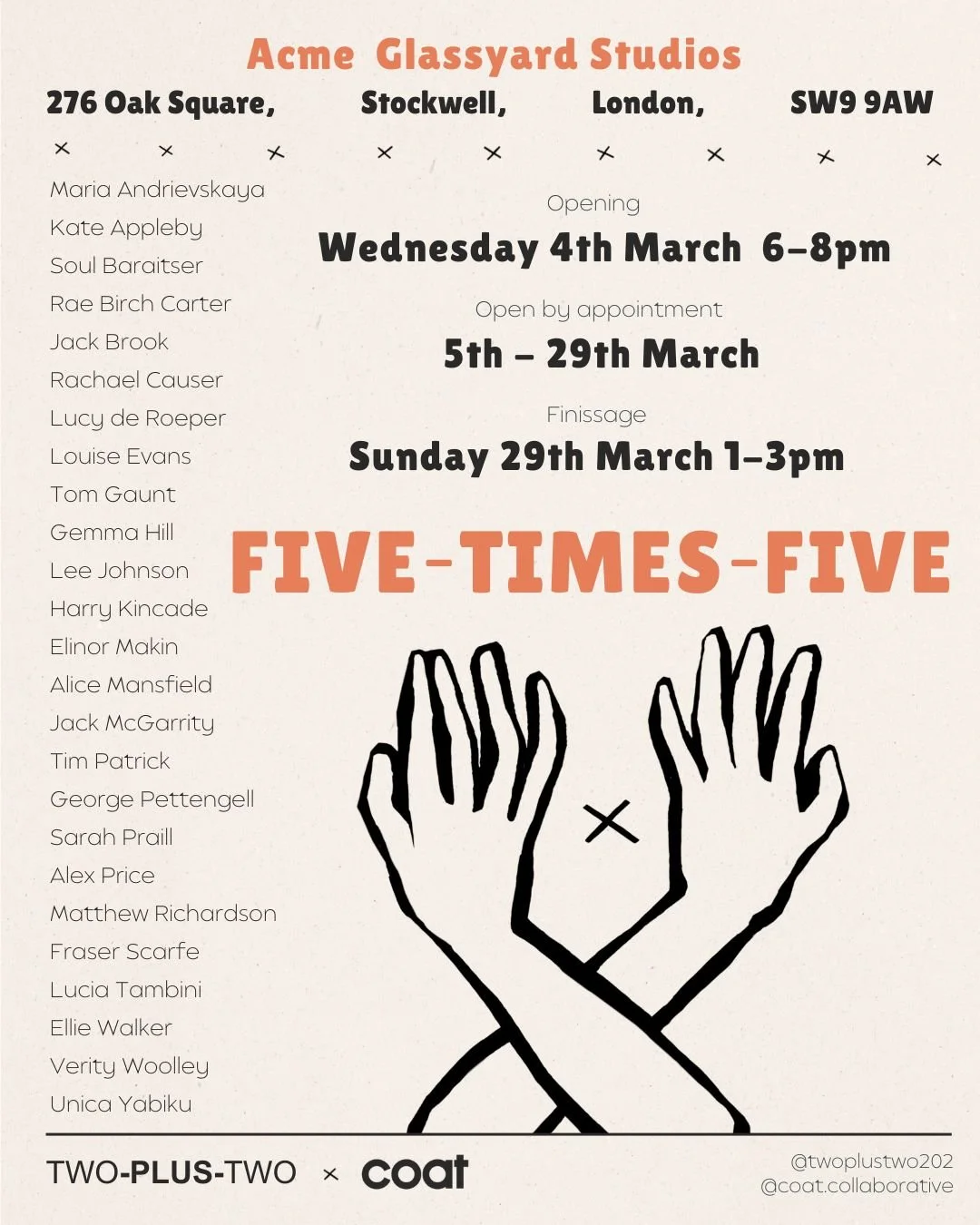 five-times-five explores the invisible networks that connect London's creative community through the simple act of invitation. Starting with five artists who each invite one artist, who invites another…. the exhibition traces these connections to reveal how practices, communities, and ideas flow through our creative ecosystem. Based on the original concept behind two-plus-two; five-times-five extends this invitation model connecting twenty five artists in a salon style exhibition.
